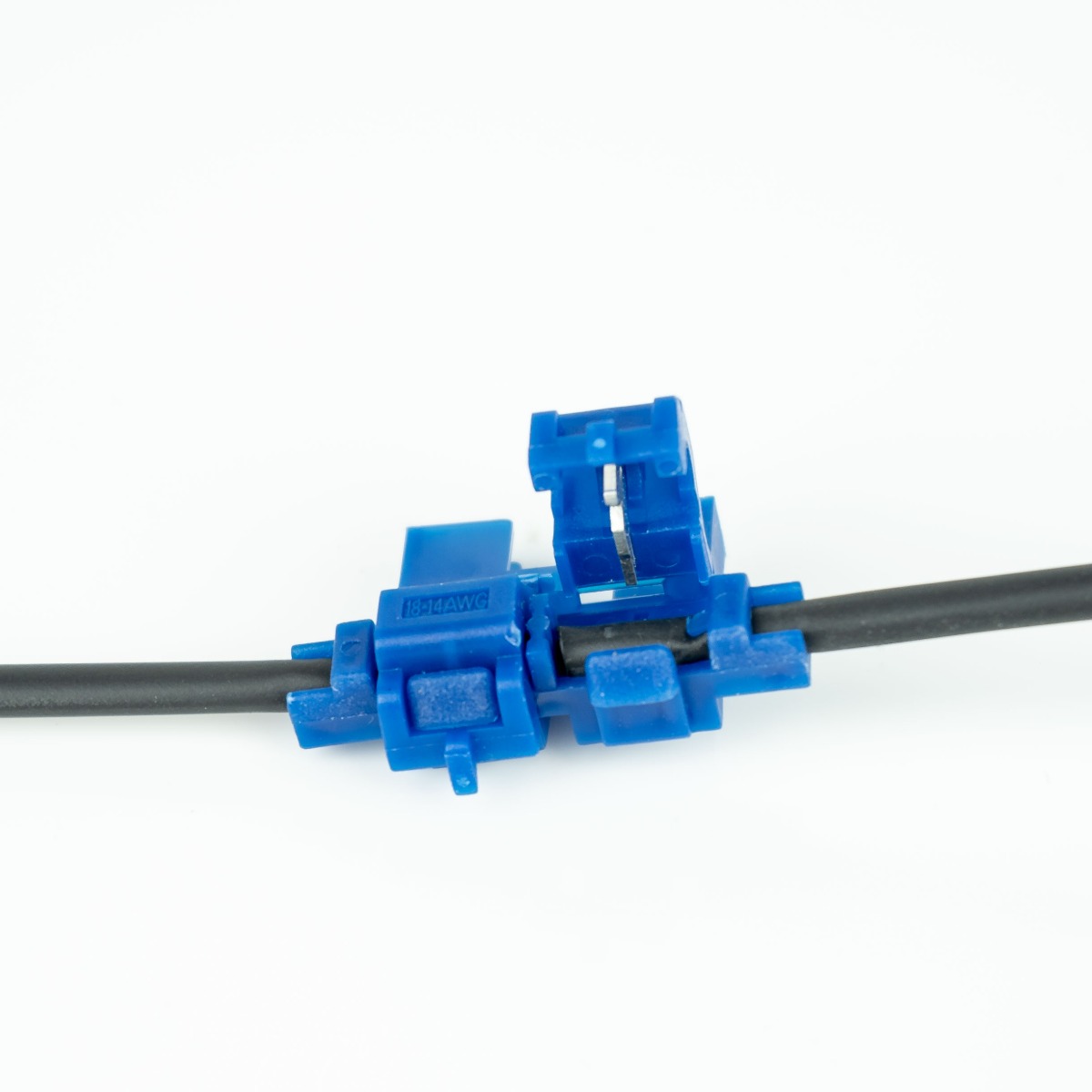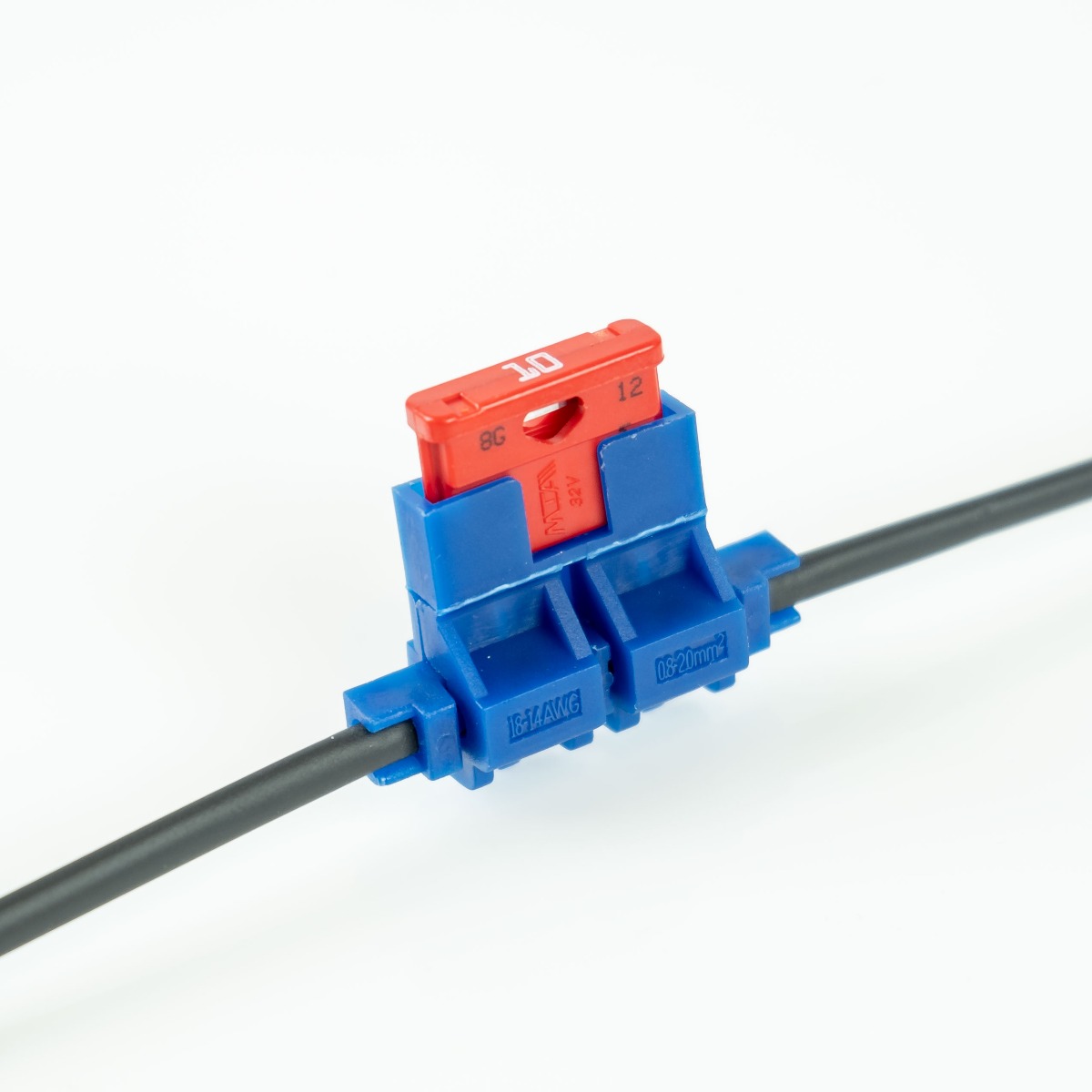Coloca el extremo de un cable en cada una de las aberturas en el costado del portafusibles. El cable no debe estar pelado antes de que se coloque en el portafusibles. Después, cierra el portafusibles. Asegúrate de que los cierres estén bloqueados correctamente. Después, coloca el fusible en la abertura indicada para su funcionamiento. Los contactos del fusible se conectan al conector de latón en el portafusibles. ¡Els fusible y portafusibles están listos para usarse!